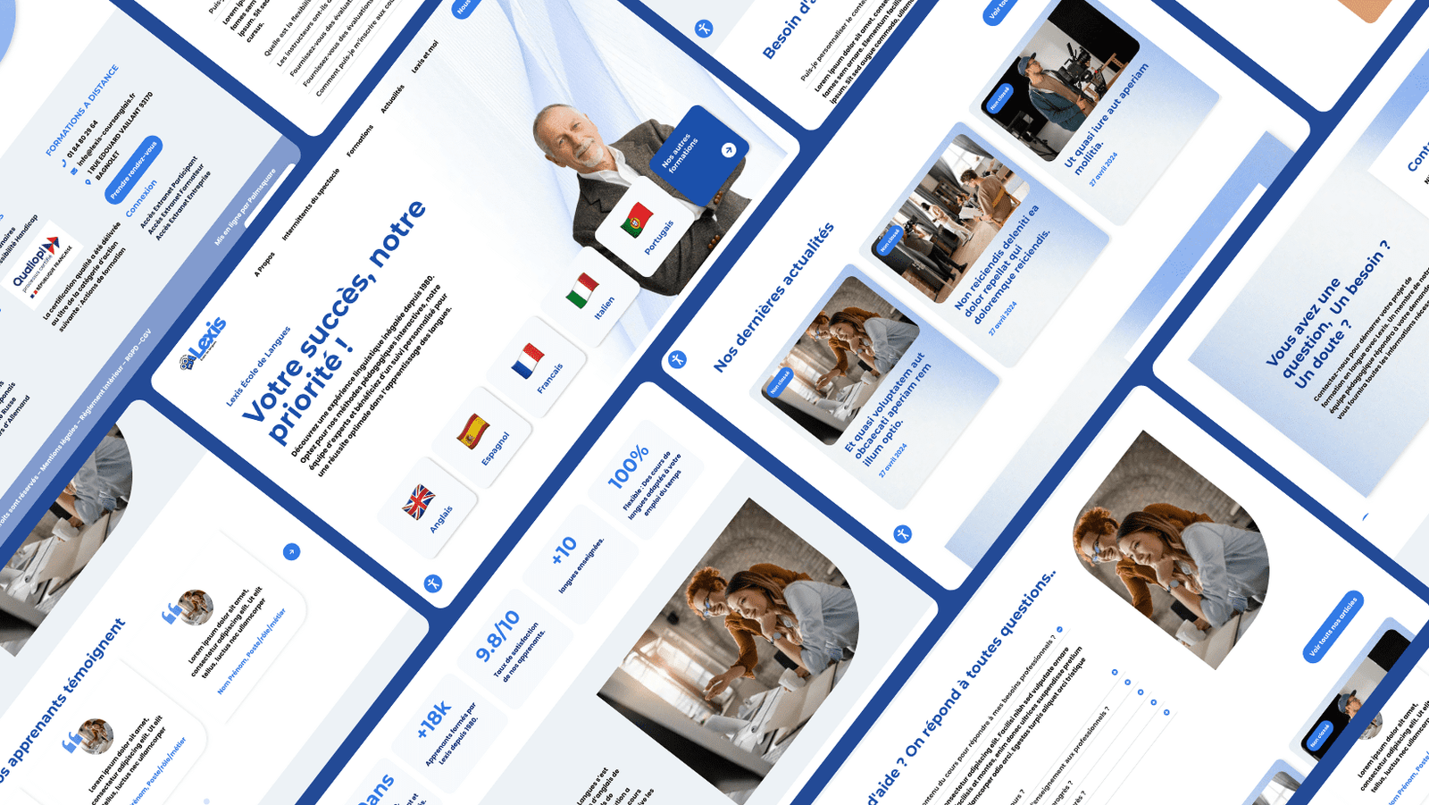 Refonte du site web de Lexis École de Langue, organisme de formation certifié Qualiopi, spécialisé dans l’apprentissage des langues étrangères. La refonte survient à la suite d’un changement de cible. L’organisme souhaitait se moderniser pour cibler un public plus jeune sans dénaturer son ancienneté