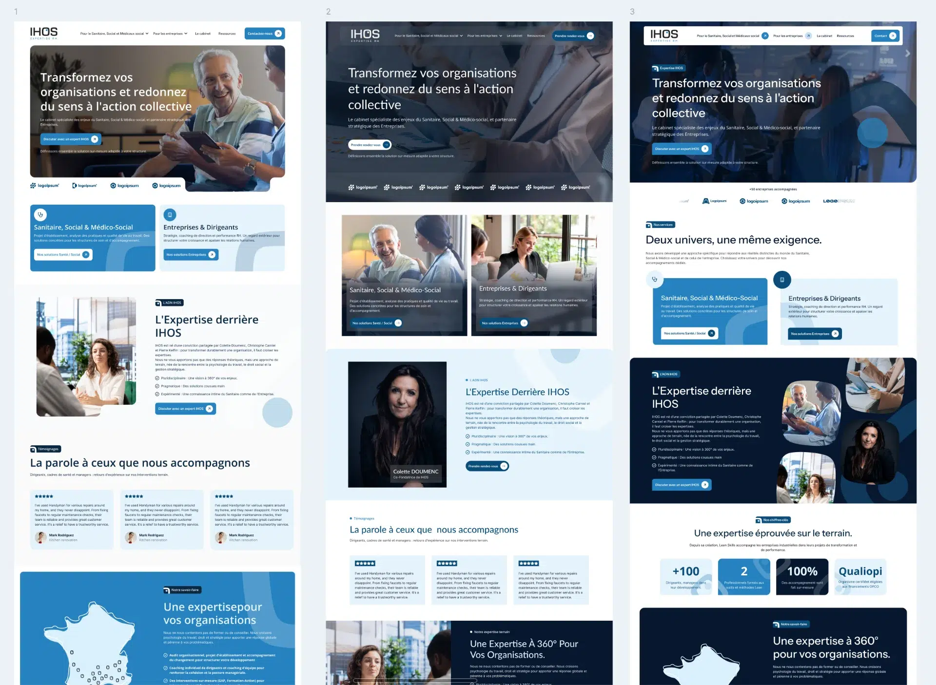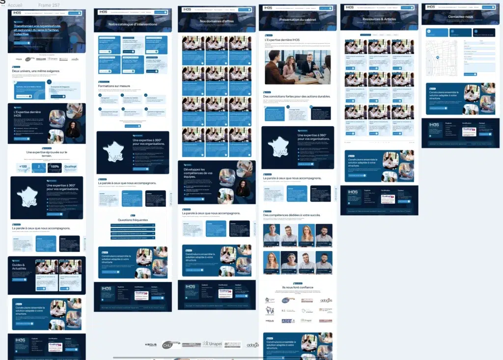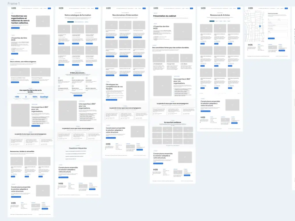 Une fois la structure validée, on a prototypé chaque page sans design. L’objectif : définir où vont les blocs, les textes, le catalogue de services et les formations, avant de penser aux couleurs.