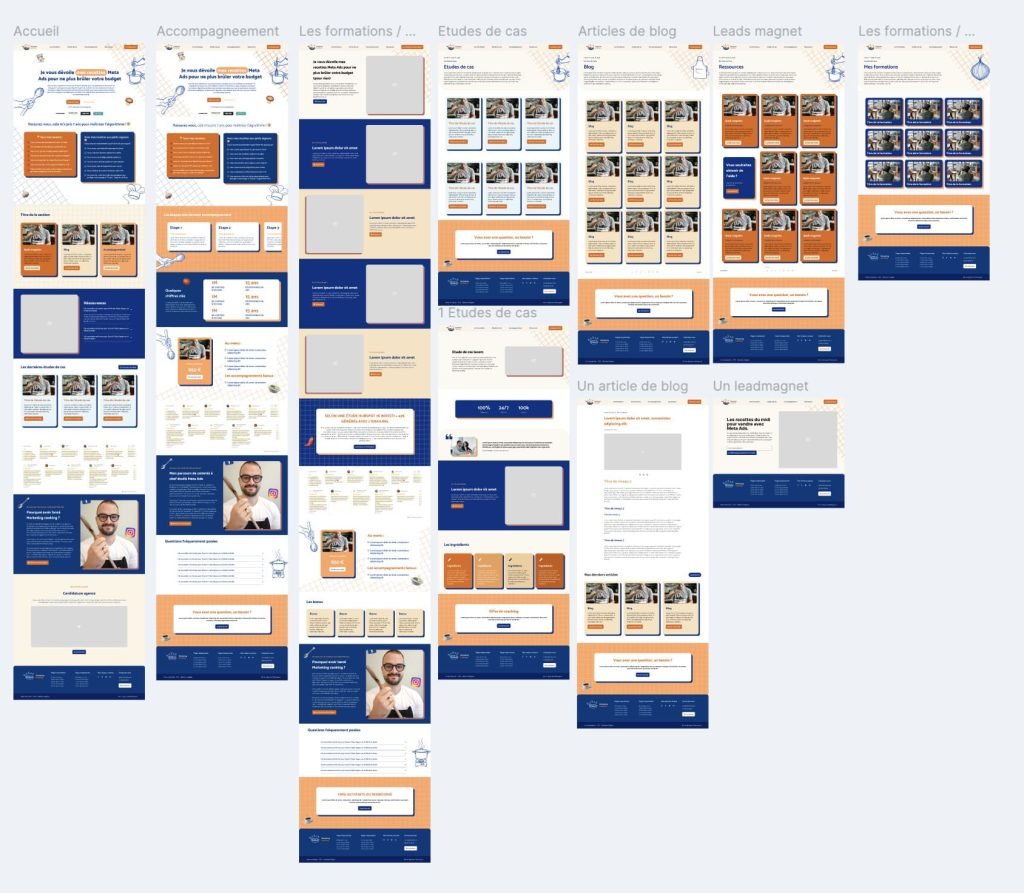 Une fois la structure des pages validée, nous sommes passés à l’étape de maquettage, en intégrant les différentes illustrations créées, la charte graphique sélectionnée ainsi que les éléments de design. Cela comprenait les rappels en arrière-plan, les couleurs et les visuels.