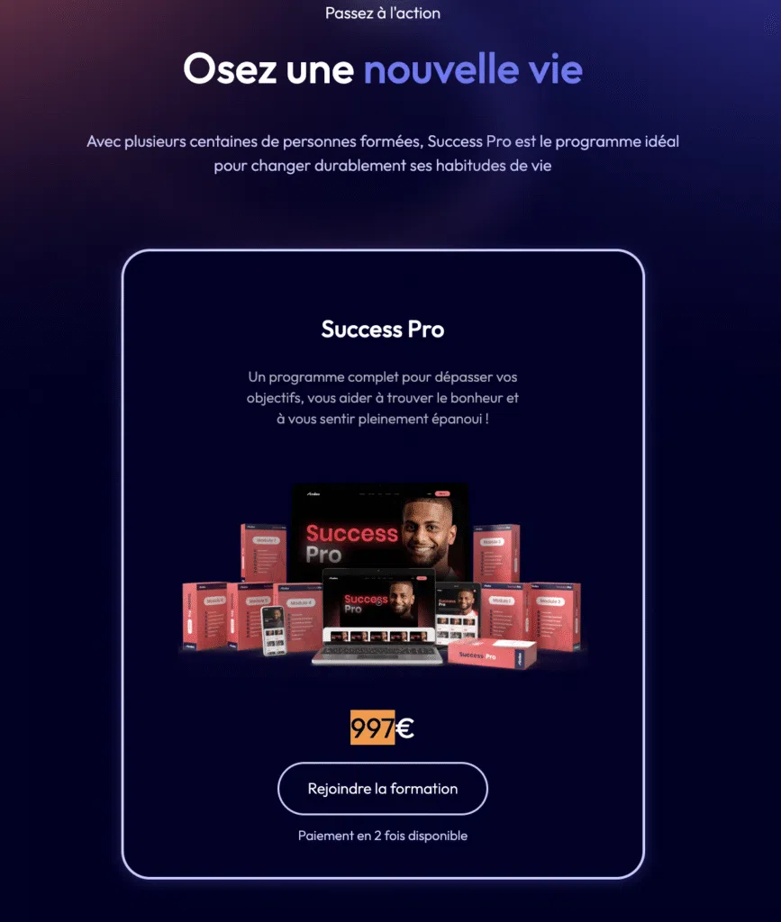 - Le pricing (997 €) est clairement affiché, avec un paiement en 2 fois → transparence + accessibilité.