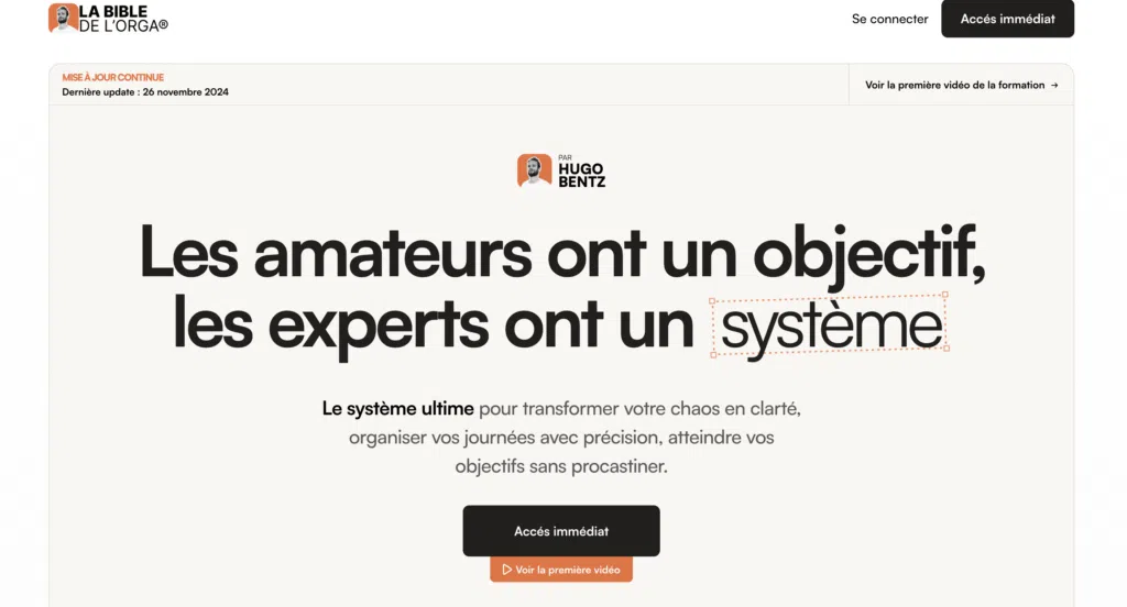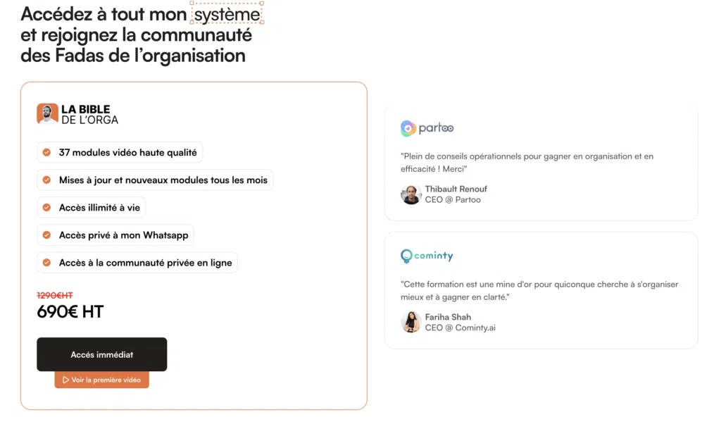 - Des phrases signature : “transformer ton chaos en clarté”, “le système ultime”, “la Bible de l’orga”