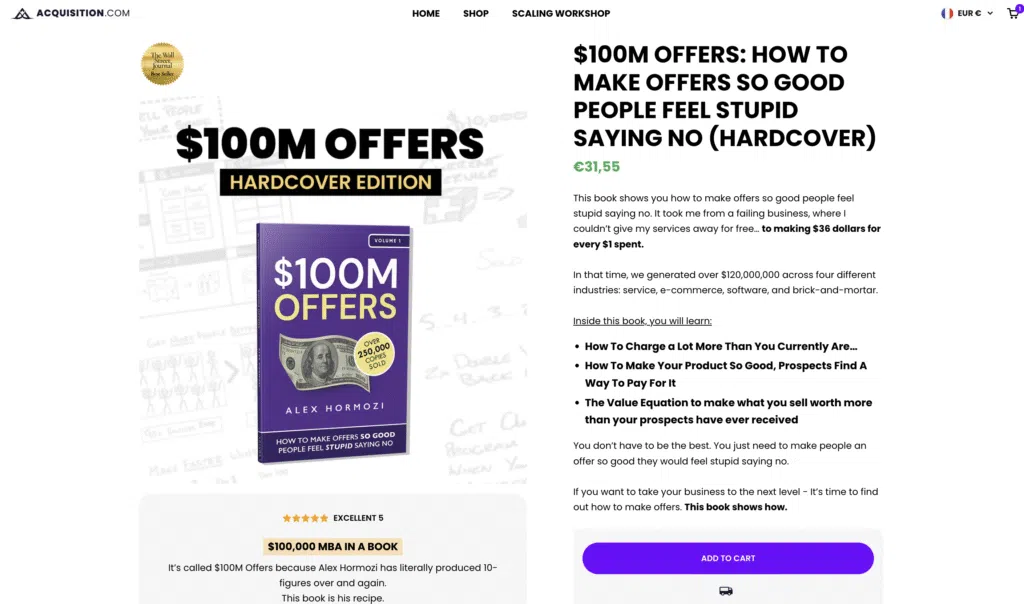 La page de vente du livre $100M Offers d’Alex Hormozi est l’exemple parfait d’une fiche produit enrichie qui ne se contente pas de vendre un objet…