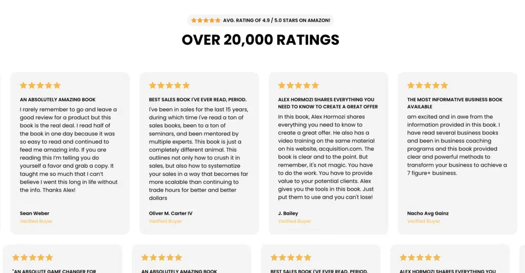 - Social proof massive : “Over 800,000 copies sold”, “Avg rating 4.9/5”, “Best sales book I’ve read”…