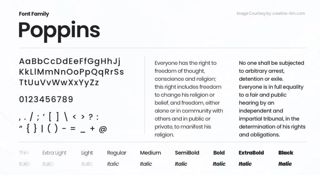 Poppins est une police sans empattement géométrique et affirmée, avec des formes parfaitement rondes et une base verticale stable. Elle apporte une présence visuelle forte sans compromettre la lisibilité.